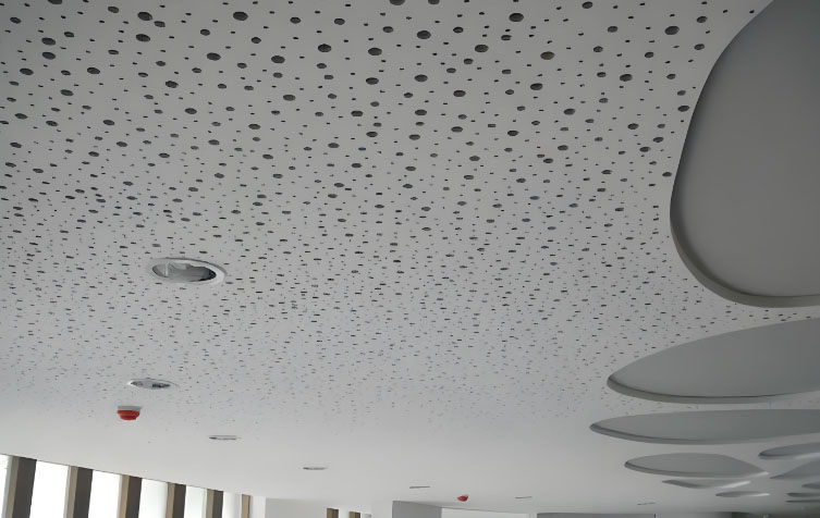 Perforated gypsum acoustic board refers to the combination of cylindrical holes through the front and back of the gypsum board, the back of the gypsum board with breathable backing material and acoustic material that can absorb the incident sound energy.